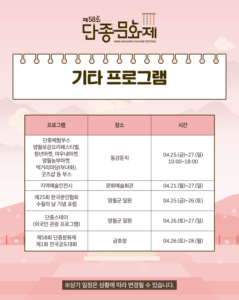 | 4월 26일(토) | 단종예술제, 명랑운동회, 마을화합체조 | 문화예술회관, 동강둔치 |