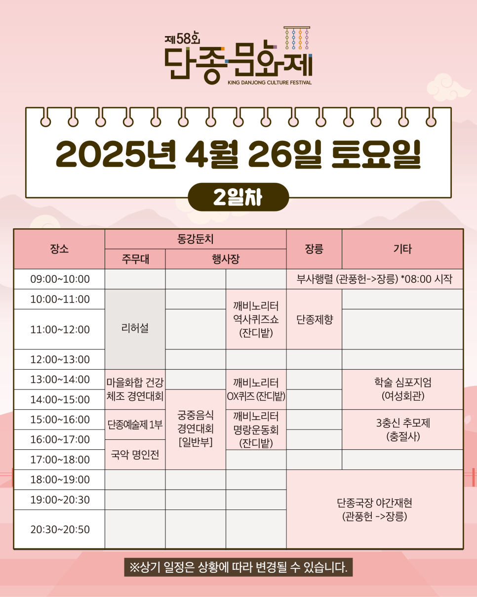 | 4월 25일(금) | 개막콘서트, 궁중음식경연대회, 단종퍼레이드 | 장릉, 동강둔치, 관풍헌 |