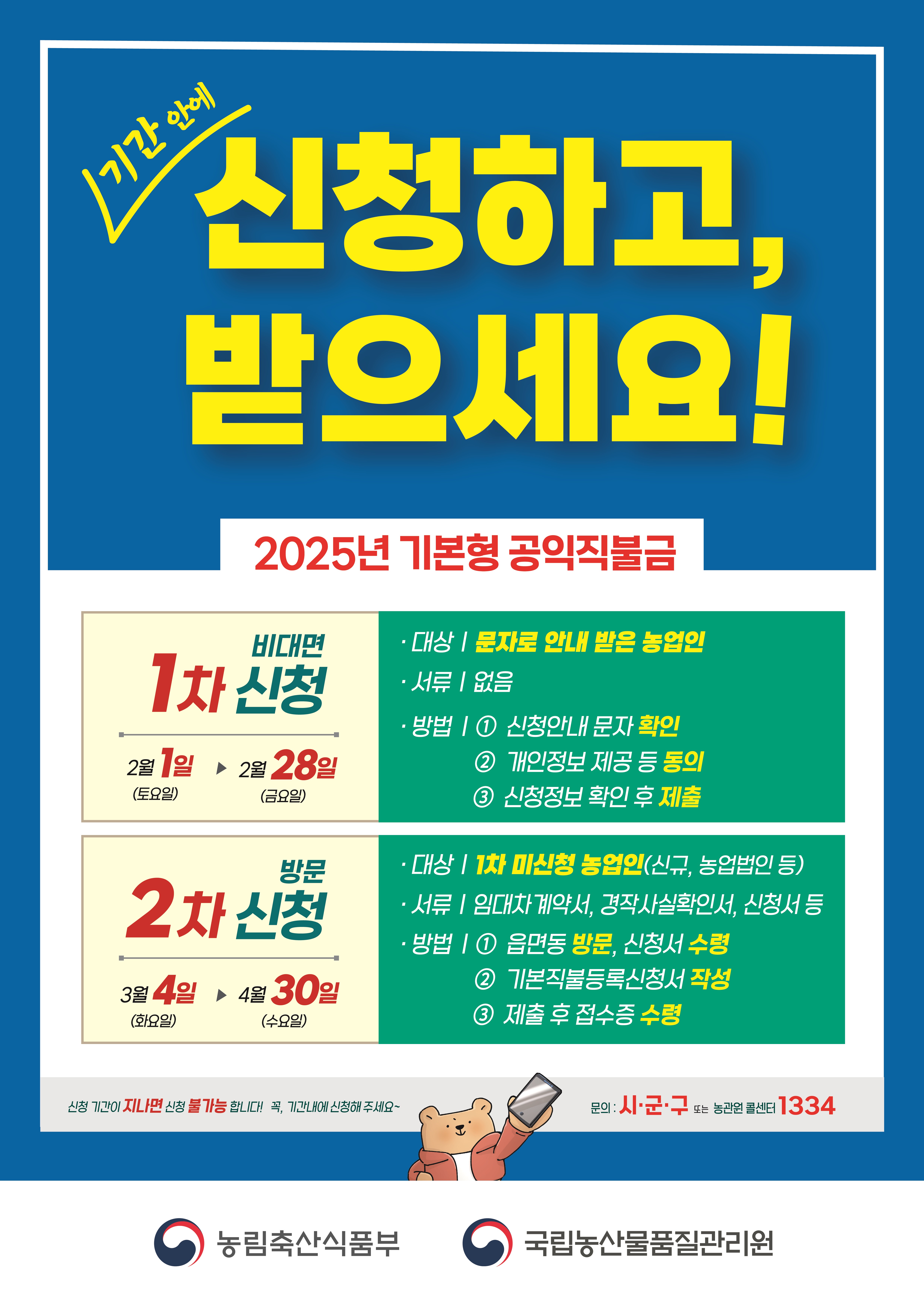 농사를 지으면서 환경도 지키고, 소득도 안정적으로 지원받을 수 있다면 어떨까요? 2025년에도 농림축산식품부는 '공익직불제'를 통해 중·소규모 농가와 친환경 농업인을 적극 지원합니다. 소농이라면 무조건 130만 원, 면적에 따라 최대 215만 원까지! 지금 신청기간 확인하고 놓치지 마세요👇